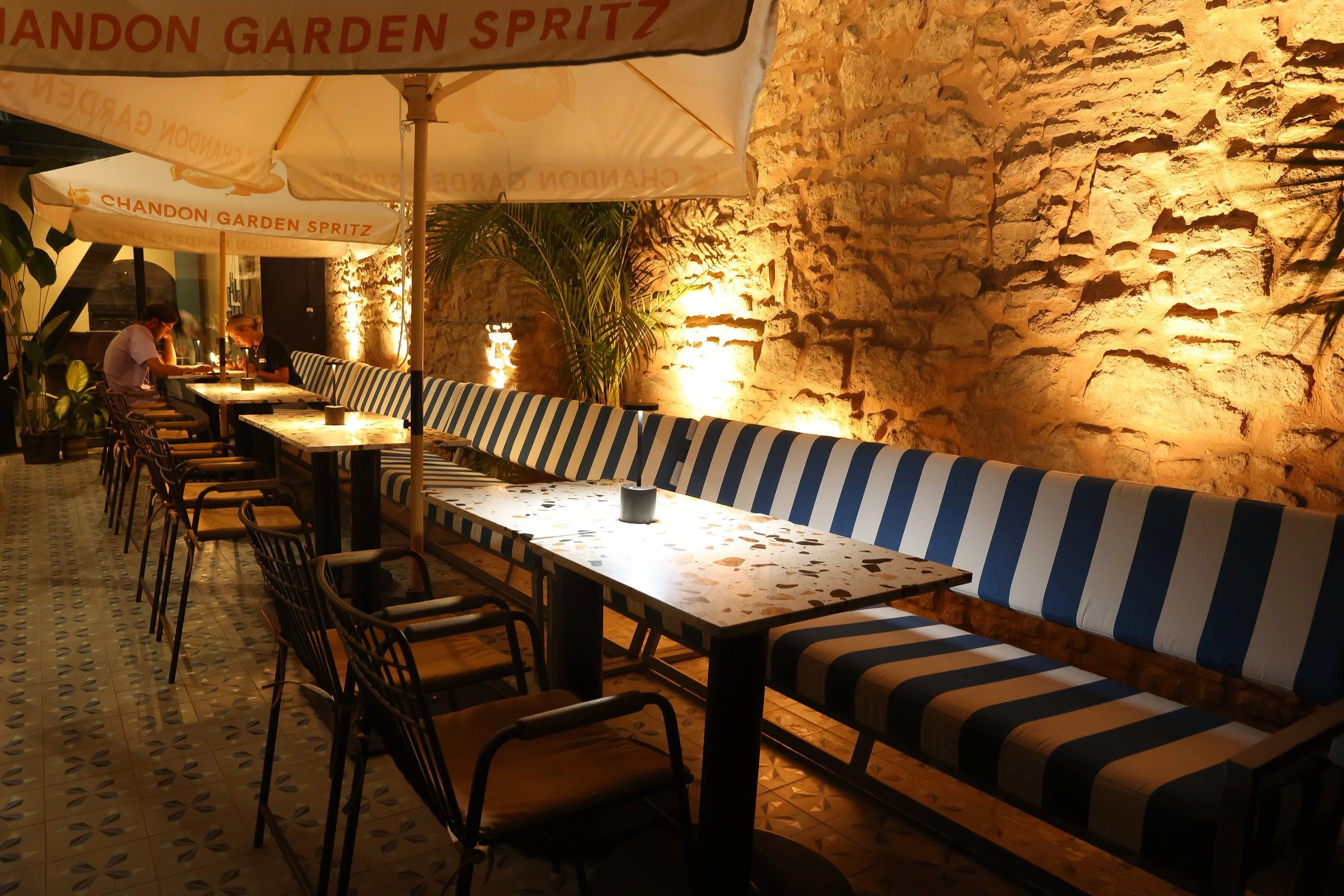 An outdoor patio with a long table and chairs, striped blue and white bench seating, umbrellas with 'Chandon Garden Spritz' branding, warm lighting, and a stone wall in the background.