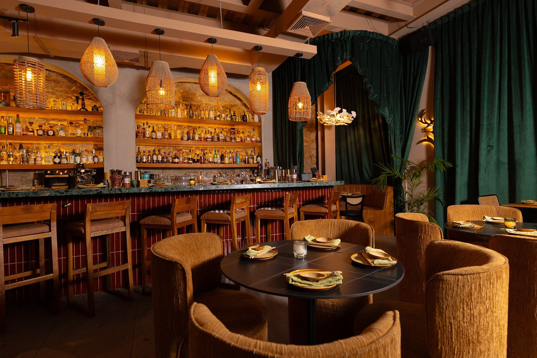 Interior of a cozy restaurant with a bar featuring a variety of bottles, warm lighting, and arranged dining tables with set plates and napkins.