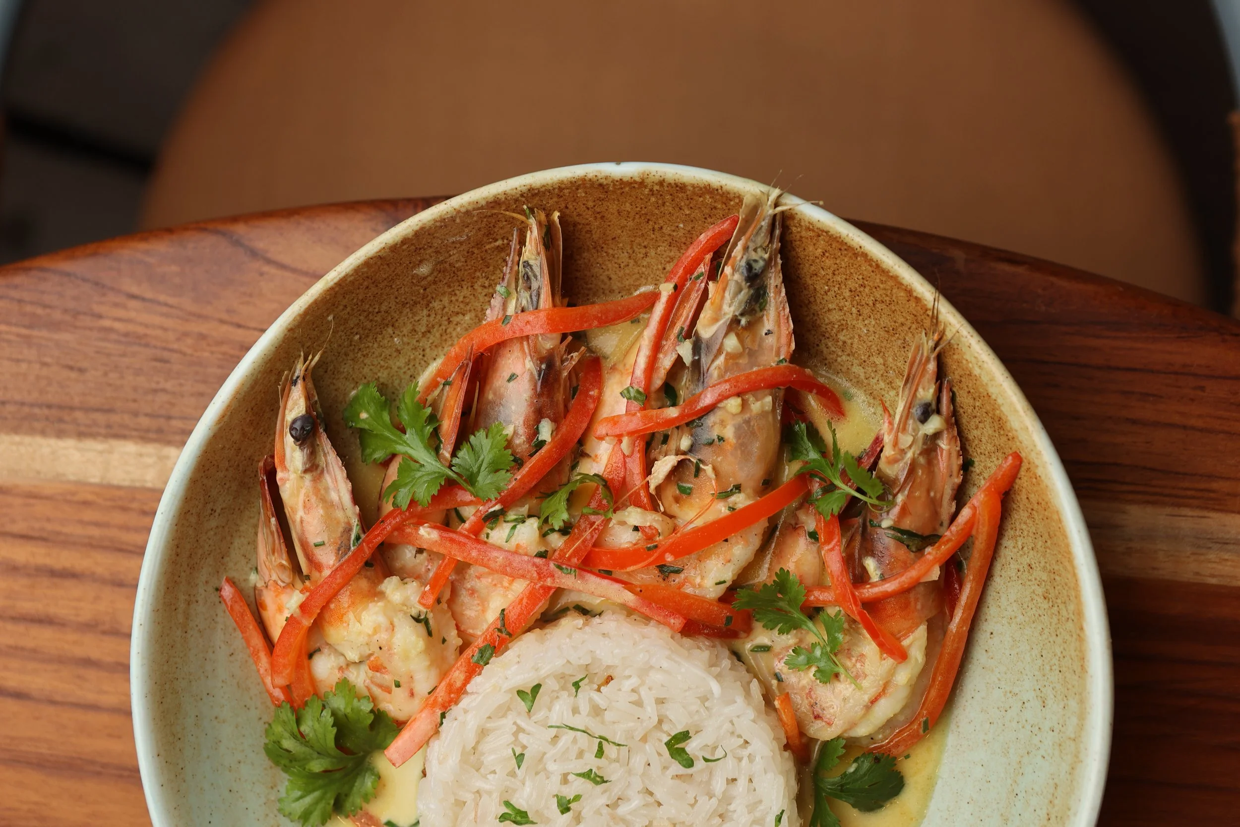 A bowl of rice with shrimp in a sauce, garnished with cilantro and red pepper strips.