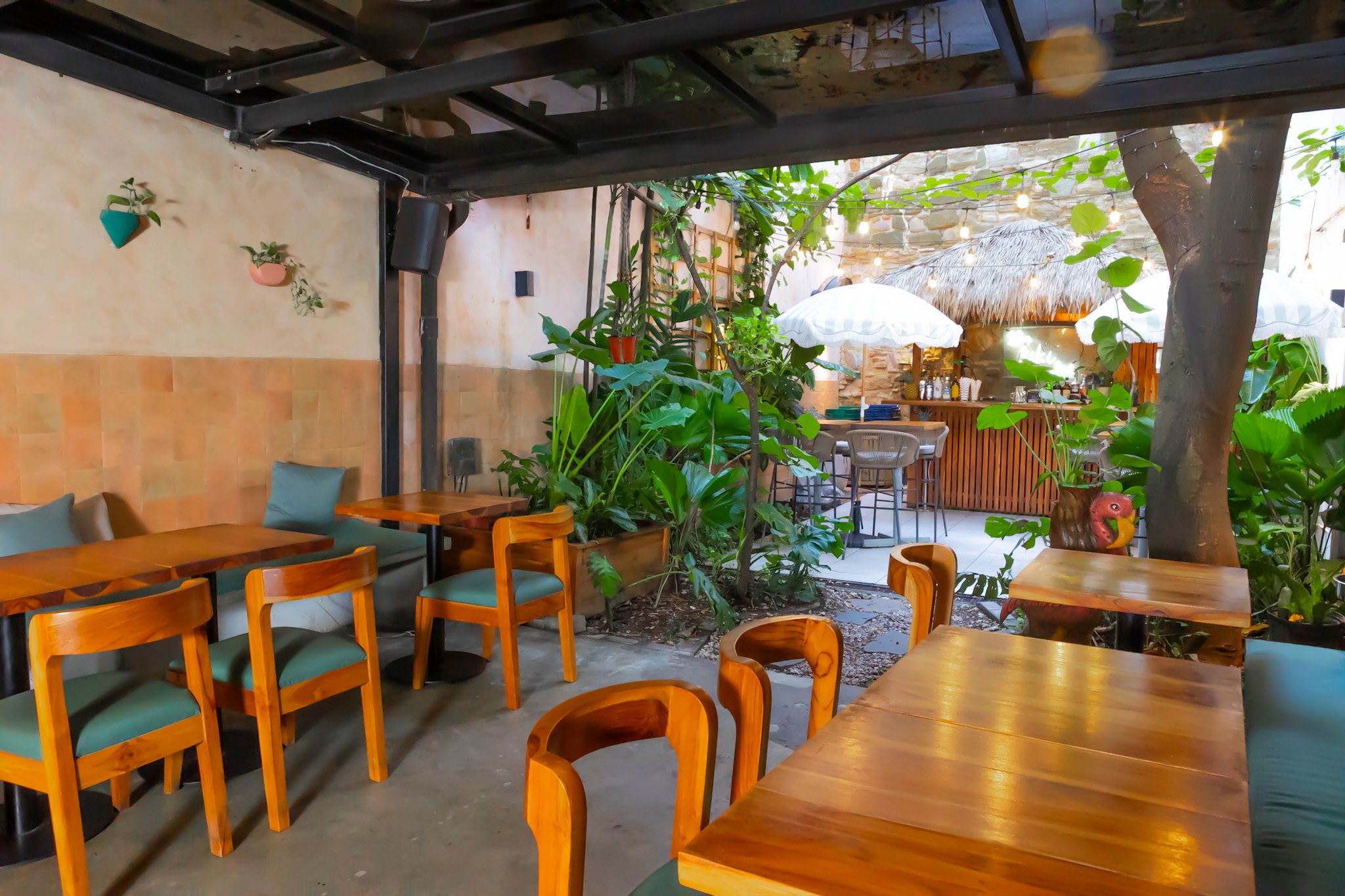 Indoor patio with wooden tables and chairs, lush green plants, a bar in the background, and string lights.