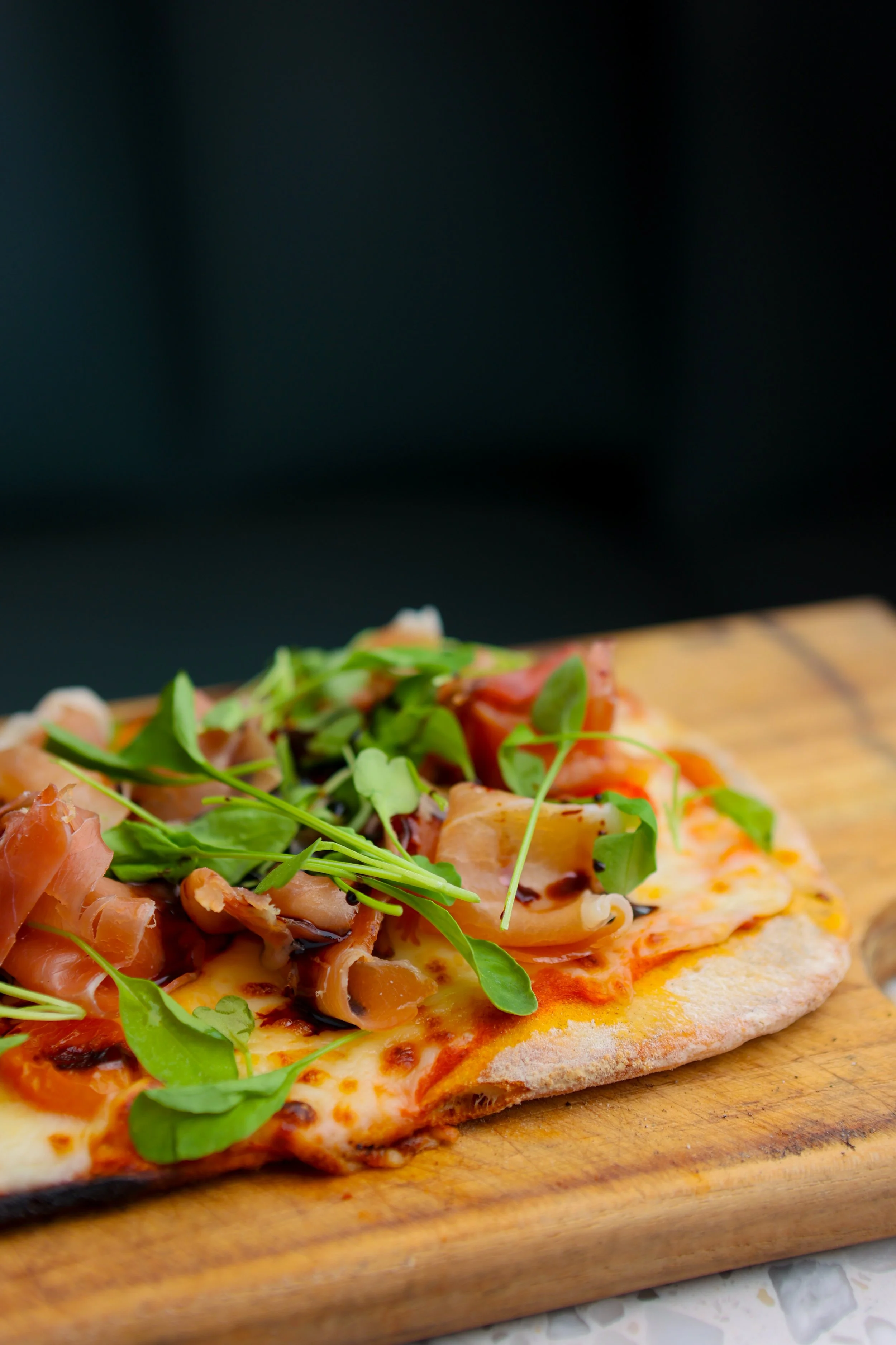 A close-up of a pizza with cheese, chicken, prosciutto, and greens on a wooden board.